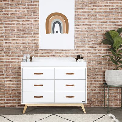 1. Invest in quality. Your new little one is the MOST precious, and you don’t want to worry about stability or tipping for a minute. Look for a dresser designed to be secure, with hardware to attach it to the wall. Bonus points for drawers that are sturdily designed to close quietly and last for years. We may be biased, but we love the new Tribeca 6- Drawer Dresser, made with our unrelenting commitment to quality and practically dripping with style. Have you seen those leather drawer pulls? Check it out here. (link)