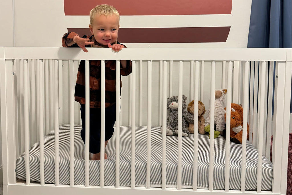 Mattress Fit: Firm and snug. If you can wedge two fingers between the mattress and crib frame, it’s too loose.